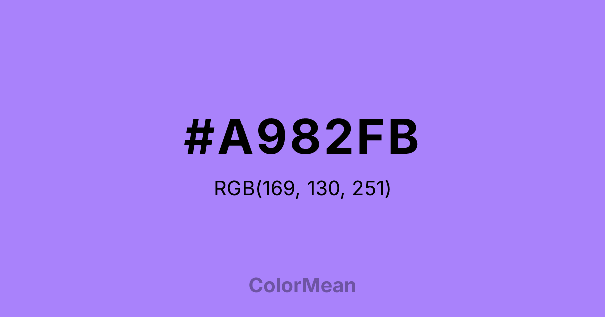 #A982FB RGB value is (169, 130, 251). The hex color red value is 169, green is 130, and blue is 251. Its HSL format shows a hue of 259°, saturation of 94 percent, and lightness of 75 percent. The CMYK process values are 33 percent, 48 percent, 0 percent, 2 percent.