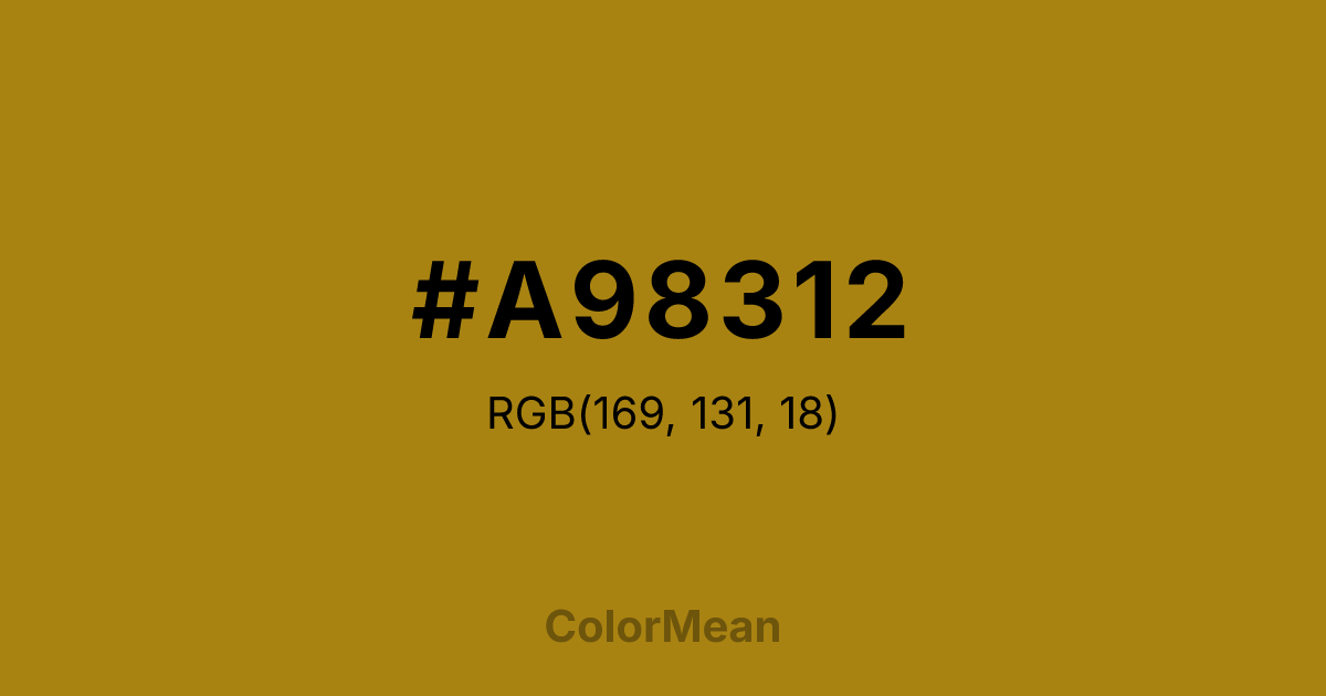 #A98312 RGB value is (169, 131, 18). The hex color red value is 169, green is 131, and blue is 18. Its HSL format shows a hue of 45°, saturation of 81 percent, and lightness of 37 percent. The CMYK process values are 0 percent, 22 percent, 89 percent, 34 percent.