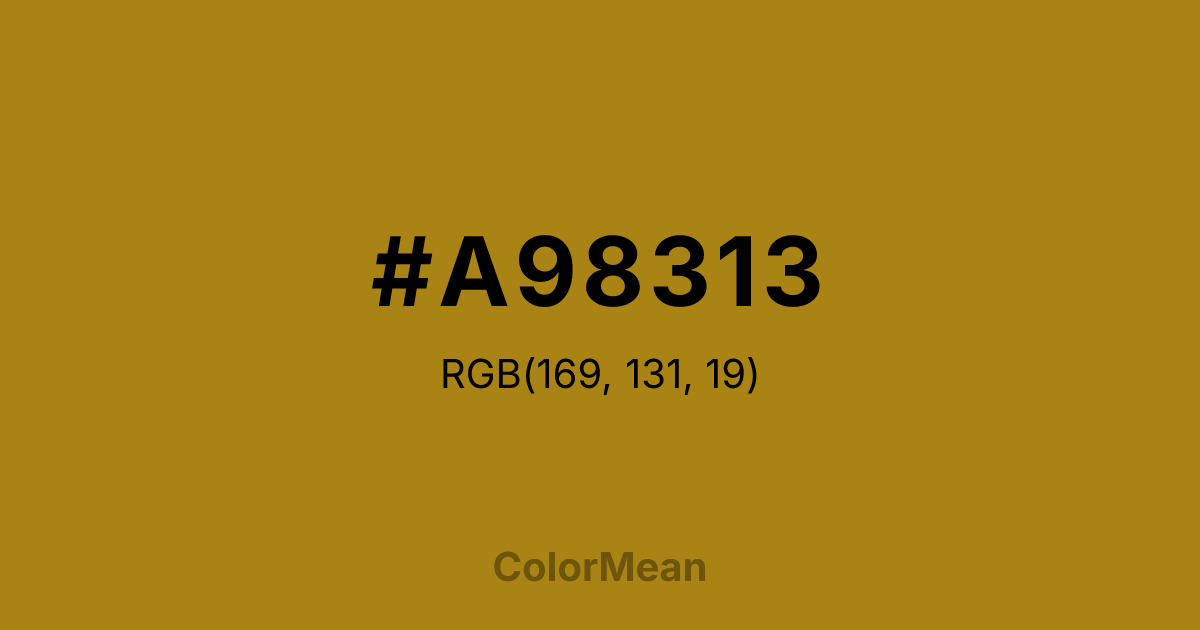 #A98313 RGB value is (169, 131, 19). The hex color red value is 169, green is 131, and blue is 19. Its HSL format shows a hue of 45°, saturation of 80 percent, and lightness of 37 percent. The CMYK process values are 0 percent, 22 percent, 89 percent, 34 percent.