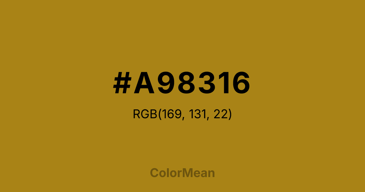 #A98316 RGB value is (169, 131, 22). The hex color red value is 169, green is 131, and blue is 22. Its HSL format shows a hue of 44°, saturation of 77 percent, and lightness of 37 percent. The CMYK process values are 0 percent, 22 percent, 87 percent, 34 percent.