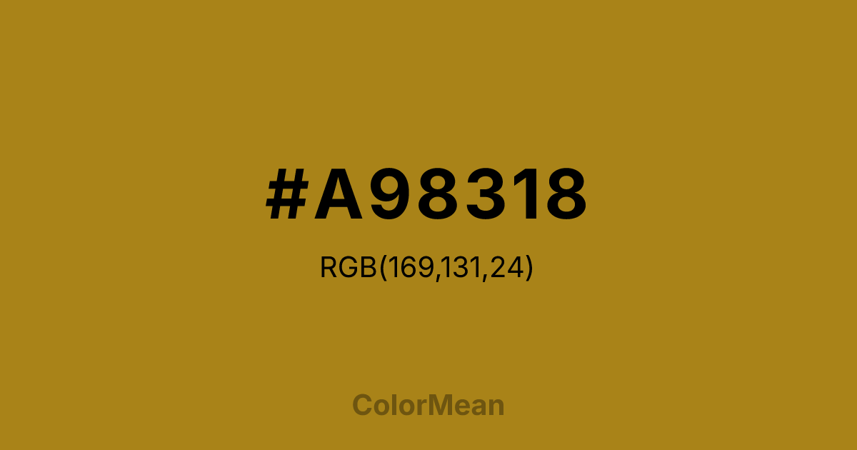 #A98318 RGB value is (169, 131, 24). The hex color red value is 169, green is 131, and blue is 24. Its HSL format shows a hue of 44°, saturation of 75 percent, and lightness of 38 percent. The CMYK process values are 0 percent, 22 percent, 86 percent, 34 percent.