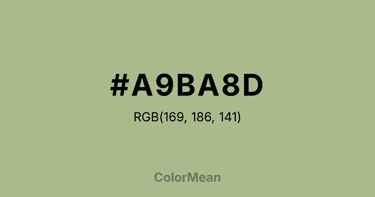 #A9BA8D RGB value is (169, 186, 141). The hex color red value is 169, green is 186, and blue is 141. Its HSL format shows a hue of 83°, saturation of 25 percent, and lightness of 64 percent. The CMYK process values are 9 percent, 0 percent, 24 percent, 27 percent.