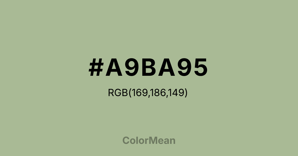#A9BA95 RGB value is (169, 186, 149). The hex color red value is 169, green is 186, and blue is 149. Its HSL format shows a hue of 88°, saturation of 21 percent, and lightness of 66 percent. The CMYK process values are 9 percent, 0 percent, 20 percent, 27 percent.