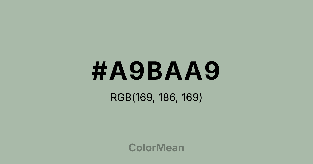 #A9BAA9 RGB value is (169, 186, 169). The hex color red value is 169, green is 186, and blue is 169. Its HSL format shows a hue of 120°, saturation of 11 percent, and lightness of 70 percent. The CMYK process values are 9 percent, 0 percent, 9 percent, 27 percent.
