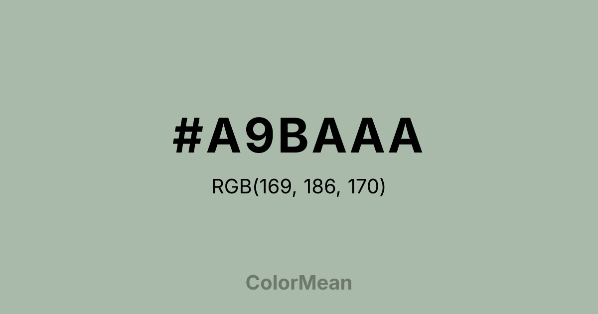 #A9BAAA RGB value is (169, 186, 170). The hex color red value is 169, green is 186, and blue is 170. Its HSL format shows a hue of 124°, saturation of 11 percent, and lightness of 70 percent. The CMYK process values are 9 percent, 0 percent, 9 percent, 27 percent.