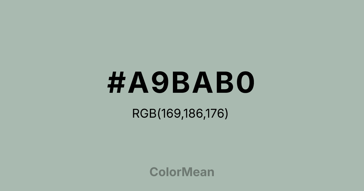 #A9BAB0 RGB value is (169, 186, 176). The hex color red value is 169, green is 186, and blue is 176. Its HSL format shows a hue of 145°, saturation of 11 percent, and lightness of 70 percent. The CMYK process values are 9 percent, 0 percent, 5 percent, 27 percent.