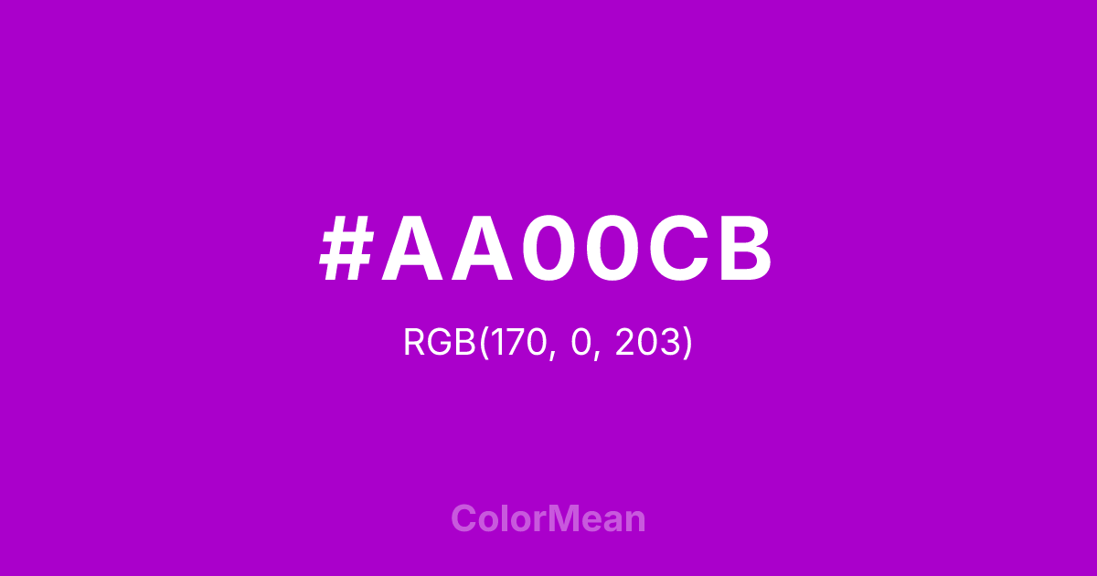 #AA00CB RGB value is (170, 0, 203). The hex color red value is 170, green is 0, and blue is 203. Its HSL format shows a hue of 290°, saturation of 100 percent, and lightness of 40 percent. The CMYK process values are 16 percent, 100 percent, 0 percent, 20 percent.