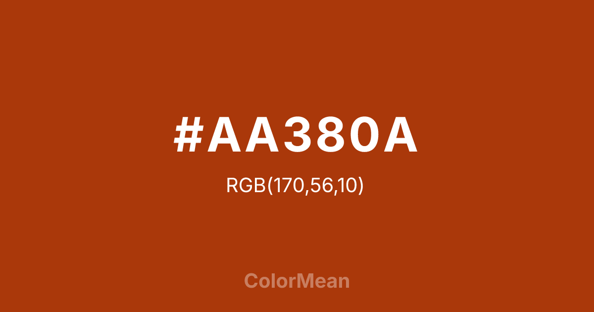 #AA380A RGB value is (170, 56, 10). The hex color red value is 170, green is 56, and blue is 10. Its HSL format shows a hue of 17°, saturation of 89 percent, and lightness of 35 percent. The CMYK process values are 0 percent, 67 percent, 94 percent, 33 percent.