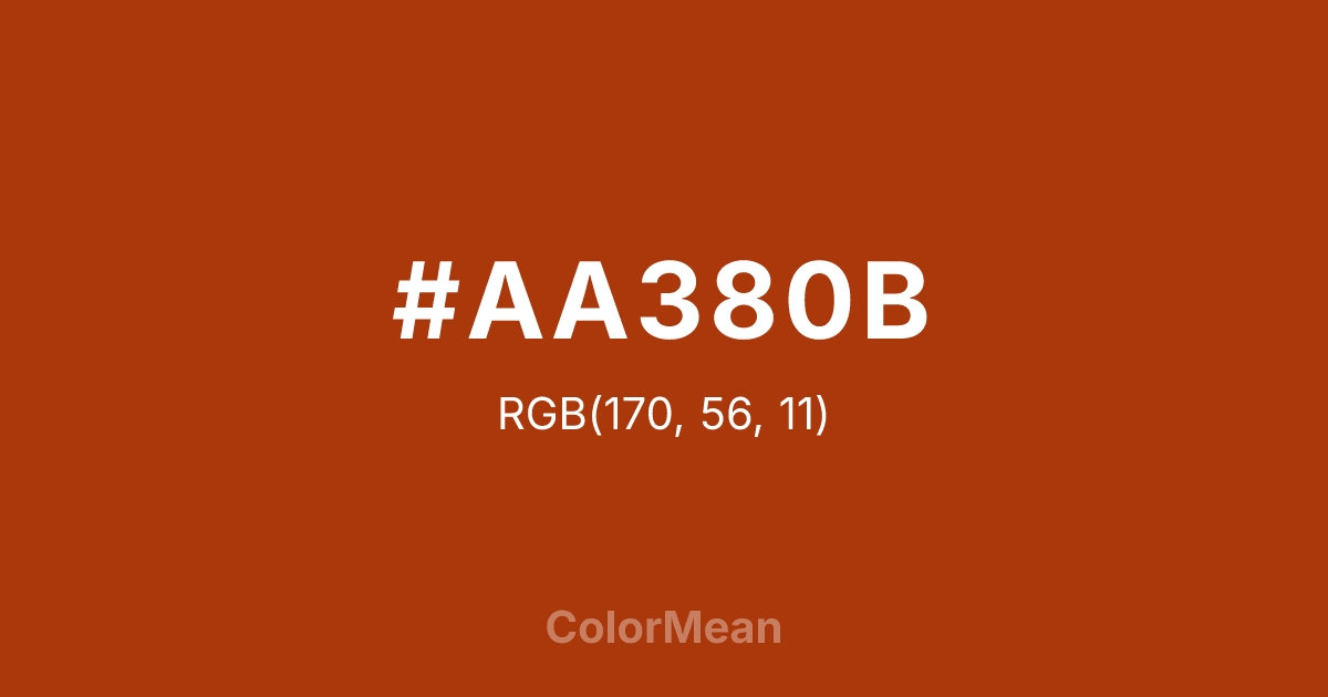 #AA380B RGB value is (170, 56, 11). The hex color red value is 170, green is 56, and blue is 11. Its HSL format shows a hue of 17°, saturation of 88 percent, and lightness of 35 percent. The CMYK process values are 0 percent, 67 percent, 94 percent, 33 percent.