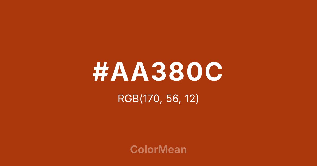 #AA380C RGB value is (170, 56, 12). The hex color red value is 170, green is 56, and blue is 12. Its HSL format shows a hue of 17°, saturation of 87 percent, and lightness of 36 percent. The CMYK process values are 0 percent, 67 percent, 93 percent, 33 percent.