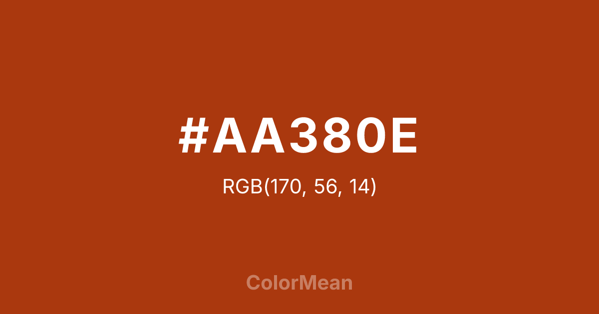 #AA380E RGB value is (170, 56, 14). The hex color red value is 170, green is 56, and blue is 14. Its HSL format shows a hue of 16°, saturation of 85 percent, and lightness of 36 percent. The CMYK process values are 0 percent, 67 percent, 92 percent, 33 percent.