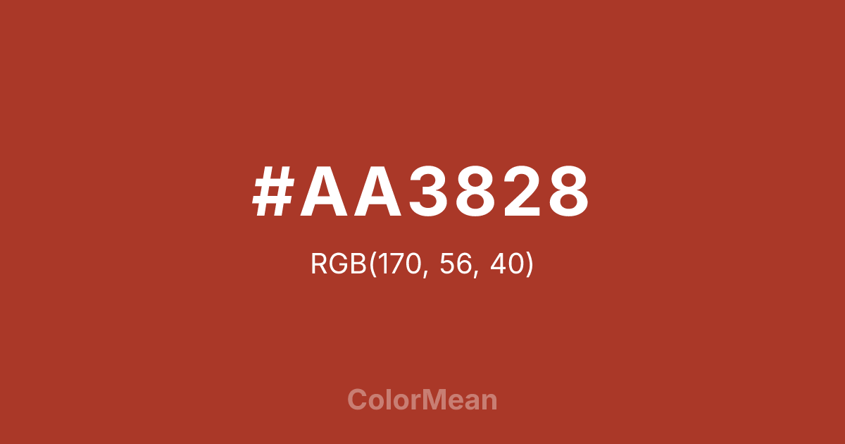 #AA3828 RGB value is (170, 56, 40). The hex color red value is 170, green is 56, and blue is 40. Its HSL format shows a hue of 7°, saturation of 62 percent, and lightness of 41 percent. The CMYK process values are 0 percent, 67 percent, 76 percent, 33 percent.