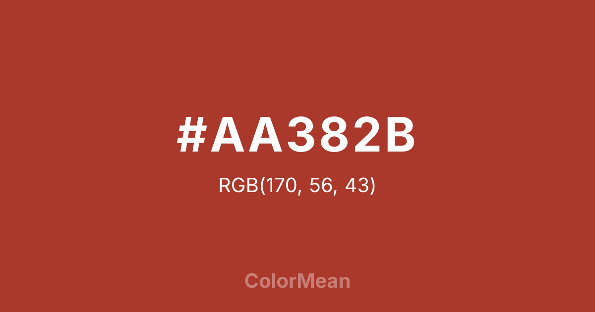 #AA382B RGB value is (170, 56, 43). The hex color red value is 170, green is 56, and blue is 43. Its HSL format shows a hue of 6°, saturation of 60 percent, and lightness of 42 percent. The CMYK process values are 0 percent, 67 percent, 75 percent, 33 percent.