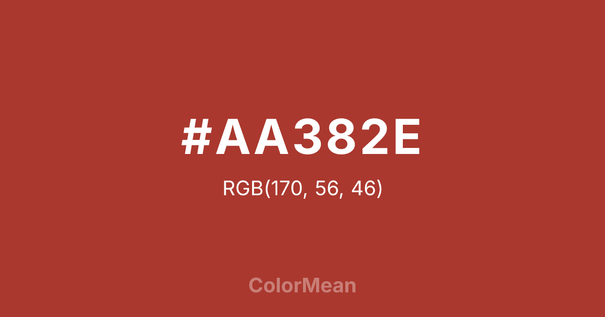#AA382E RGB value is (170, 56, 46). The hex color red value is 170, green is 56, and blue is 46. Its HSL format shows a hue of 5°, saturation of 57 percent, and lightness of 42 percent. The CMYK process values are 0 percent, 67 percent, 73 percent, 33 percent.