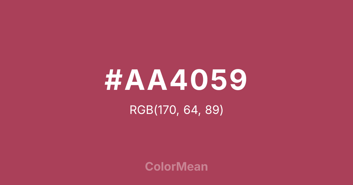 #AA4059 RGB value is (170, 64, 89). The hex color red value is 170, green is 64, and blue is 89. Its HSL format shows a hue of 346°, saturation of 45 percent, and lightness of 46 percent. The CMYK process values are 0 percent, 62 percent, 48 percent, 33 percent.