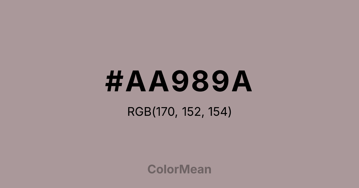 #AA989A RGB value is (170, 152, 154). The hex color red value is 170, green is 152, and blue is 154. Its HSL format shows a hue of 353°, saturation of 10 percent, and lightness of 63 percent. The CMYK process values are 0 percent, 11 percent, 9 percent, 33 percent.