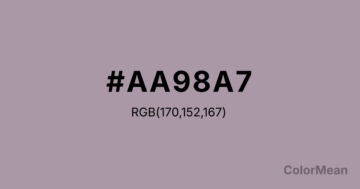 #AA98A7 RGB value is (170, 152, 167). The hex color red value is 170, green is 152, and blue is 167. Its HSL format shows a hue of 310°, saturation of 10 percent, and lightness of 63 percent. The CMYK process values are 0 percent, 11 percent, 2 percent, 33 percent.