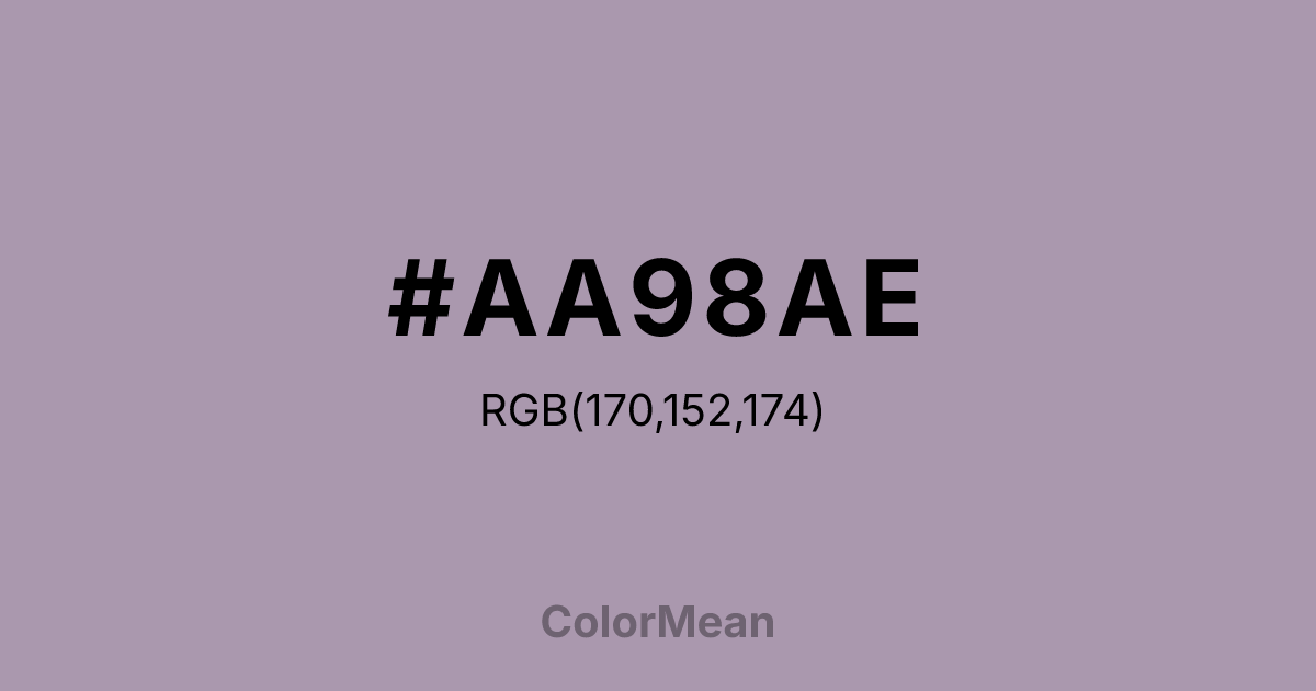 #AA98AE RGB value is (170, 152, 174). The hex color red value is 170, green is 152, and blue is 174. Its HSL format shows a hue of 289°, saturation of 12 percent, and lightness of 64 percent. The CMYK process values are 2 percent, 13 percent, 0 percent, 32 percent.