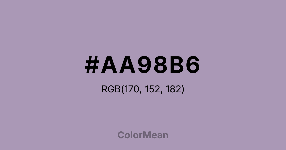 #AA98B6 RGB value is (170, 152, 182). The hex color red value is 170, green is 152, and blue is 182. Its HSL format shows a hue of 276°, saturation of 17 percent, and lightness of 65 percent. The CMYK process values are 7 percent, 16 percent, 0 percent, 29 percent.