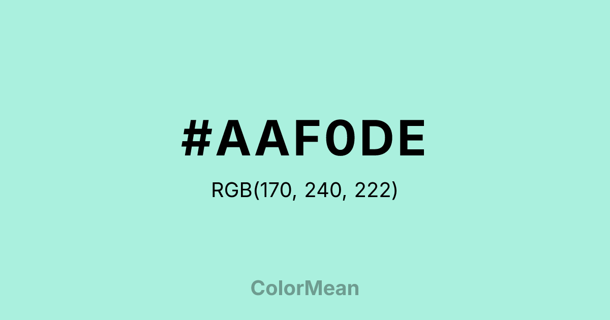 #AAF0DE RGB value is (170, 240, 222). The hex color red value is 170, green is 240, and blue is 222. Its HSL format shows a hue of 165°, saturation of 70 percent, and lightness of 80 percent. The CMYK process values are 29 percent, 0 percent, 7 percent, 6 percent.