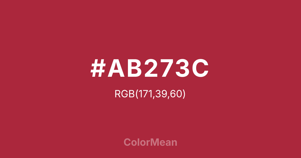 #AB273C RGB value is (171, 39, 60). The hex color red value is 171, green is 39, and blue is 60. Its HSL format shows a hue of 350°, saturation of 63 percent, and lightness of 41 percent. The CMYK process values are 0 percent, 77 percent, 65 percent, 33 percent.