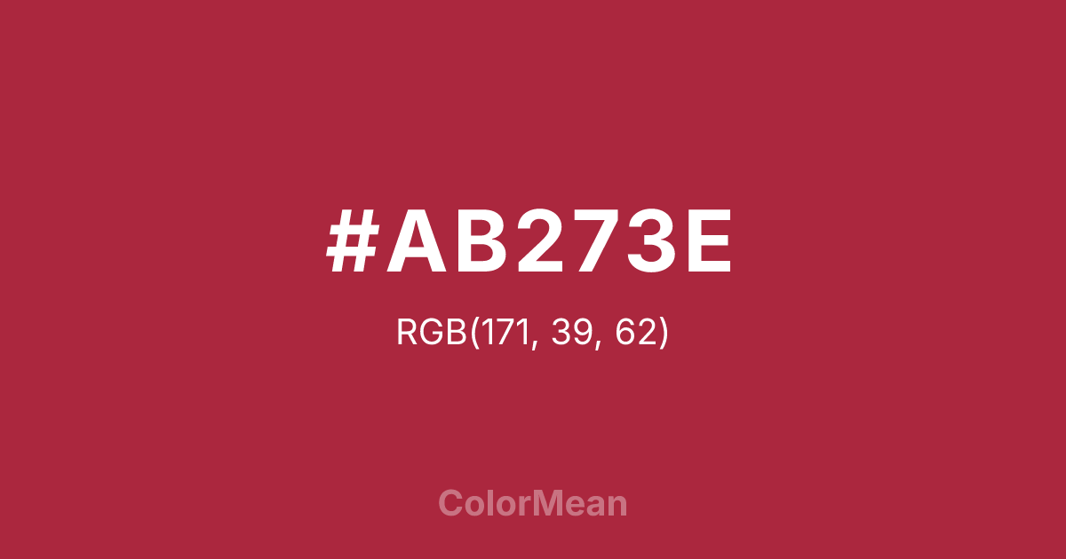 #AB273E RGB value is (171, 39, 62). The hex color red value is 171, green is 39, and blue is 62. Its HSL format shows a hue of 350°, saturation of 63 percent, and lightness of 41 percent. The CMYK process values are 0 percent, 77 percent, 64 percent, 33 percent.