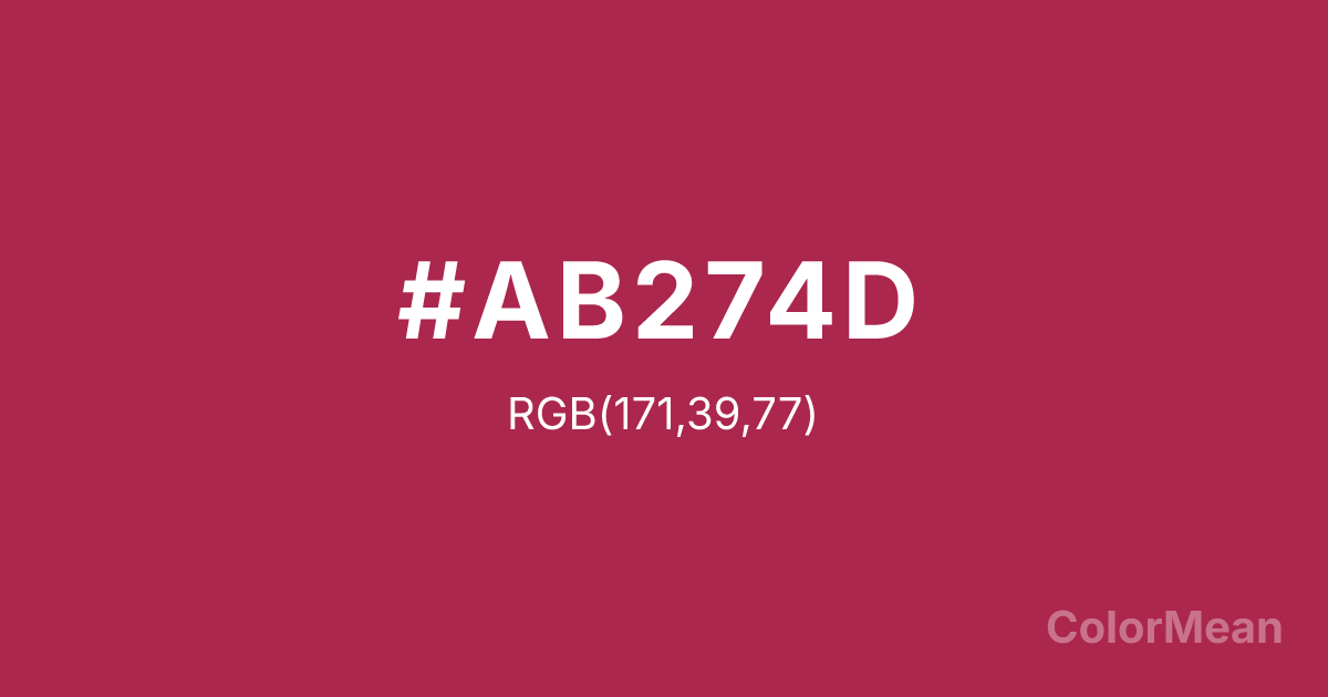 #AB274D RGB value is (171, 39, 77). The hex color red value is 171, green is 39, and blue is 77. Its HSL format shows a hue of 343°, saturation of 63 percent, and lightness of 41 percent. The CMYK process values are 0 percent, 77 percent, 55 percent, 33 percent.
