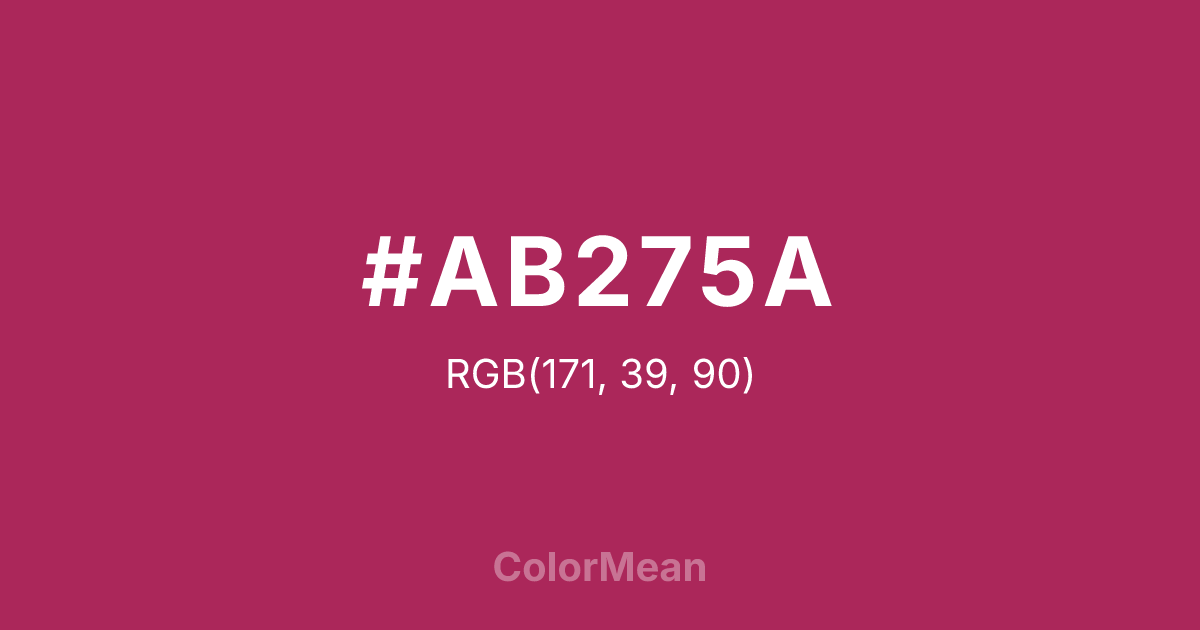 #AB275A RGB value is (171, 39, 90). The hex color red value is 171, green is 39, and blue is 90. Its HSL format shows a hue of 337°, saturation of 63 percent, and lightness of 41 percent. The CMYK process values are 0 percent, 77 percent, 47 percent, 33 percent.