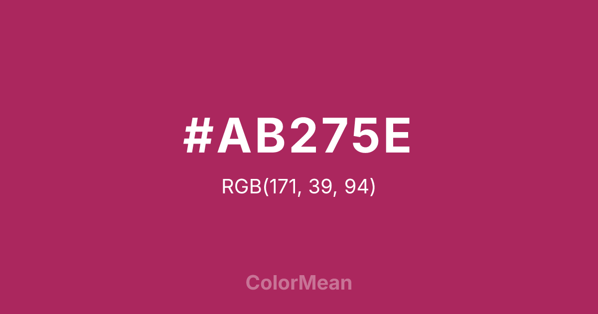 #AB275E RGB value is (171, 39, 94). The hex color red value is 171, green is 39, and blue is 94. Its HSL format shows a hue of 335°, saturation of 63 percent, and lightness of 41 percent. The CMYK process values are 0 percent, 77 percent, 45 percent, 33 percent.
