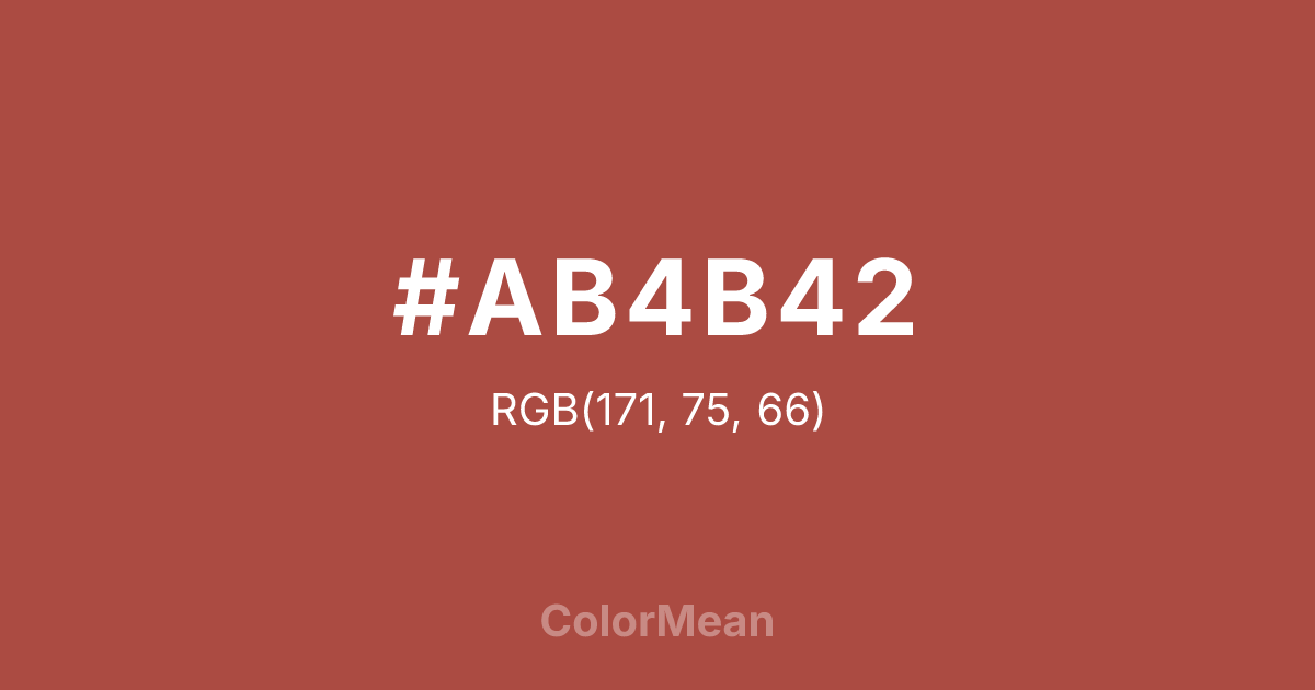 #AB4B42 RGB value is (171, 75, 66). The hex color red value is 171, green is 75, and blue is 66. Its HSL format shows a hue of 5°, saturation of 44 percent, and lightness of 46 percent. The CMYK process values are 0 percent, 56 percent, 61 percent, 33 percent.