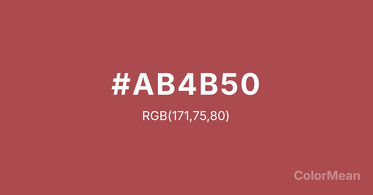 #AB4B50 RGB value is (171, 75, 80). The hex color red value is 171, green is 75, and blue is 80. Its HSL format shows a hue of 357°, saturation of 39 percent, and lightness of 48 percent. The CMYK process values are 0 percent, 56 percent, 53 percent, 33 percent.