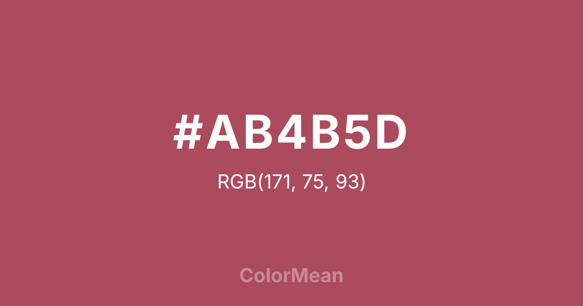 #AB4B5D RGB value is (171, 75, 93). The hex color red value is 171, green is 75, and blue is 93. Its HSL format shows a hue of 349°, saturation of 39 percent, and lightness of 48 percent. The CMYK process values are 0 percent, 56 percent, 46 percent, 33 percent.