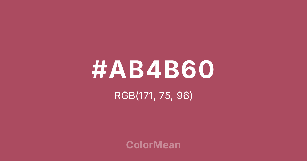 #AB4B60 RGB value is (171, 75, 96). The hex color red value is 171, green is 75, and blue is 96. Its HSL format shows a hue of 347°, saturation of 39 percent, and lightness of 48 percent. The CMYK process values are 0 percent, 56 percent, 44 percent, 33 percent.