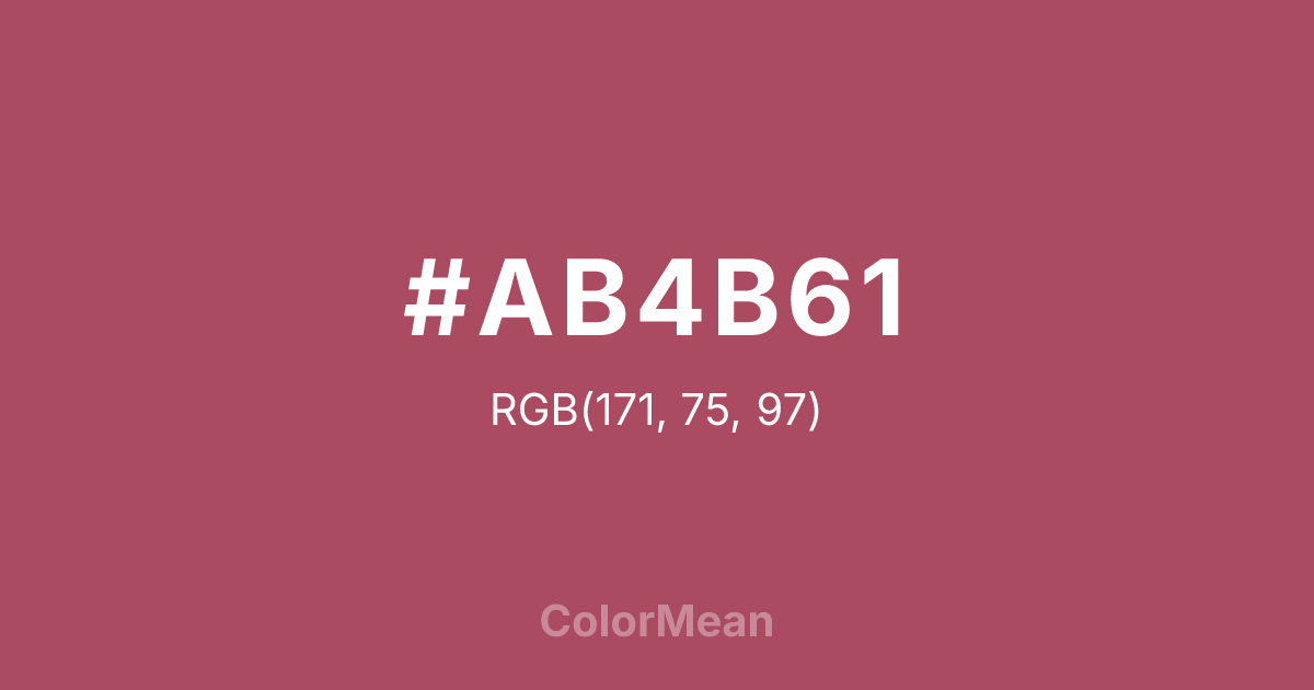 #AB4B61 RGB value is (171, 75, 97). The hex color red value is 171, green is 75, and blue is 97. Its HSL format shows a hue of 346°, saturation of 39 percent, and lightness of 48 percent. The CMYK process values are 0 percent, 56 percent, 43 percent, 33 percent.