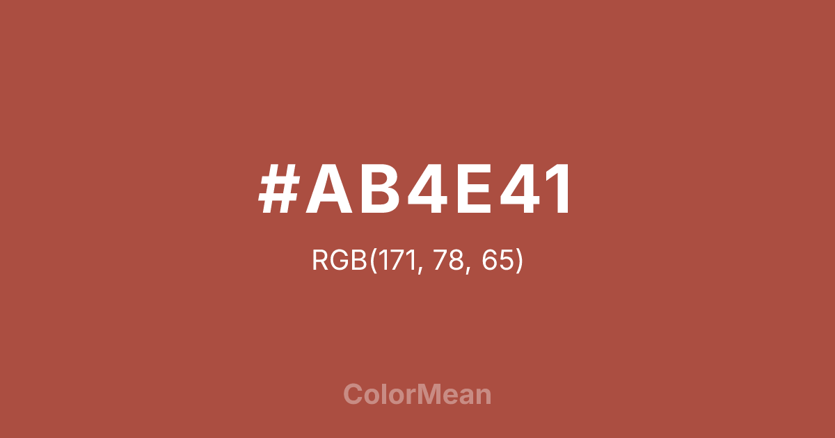 #AB4E41 RGB value is (171, 78, 65). The hex color red value is 171, green is 78, and blue is 65. Its HSL format shows a hue of 7°, saturation of 45 percent, and lightness of 46 percent. The CMYK process values are 0 percent, 54 percent, 62 percent, 33 percent.