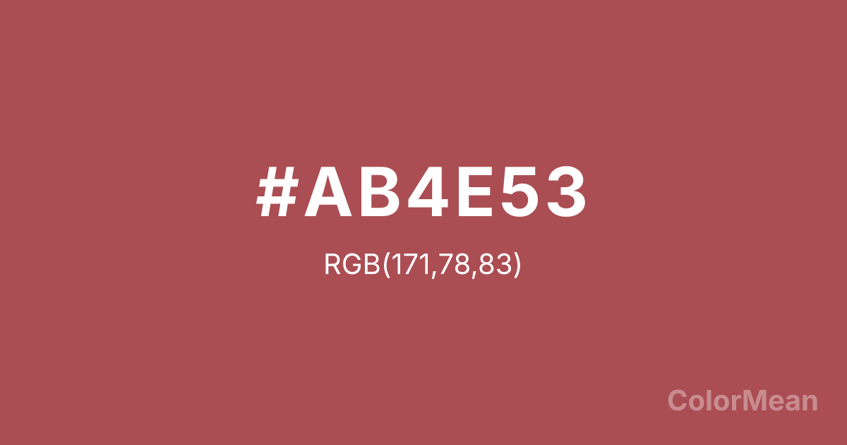 #AB4E53 RGB value is (171, 78, 83). The hex color red value is 171, green is 78, and blue is 83. Its HSL format shows a hue of 357°, saturation of 37 percent, and lightness of 49 percent. The CMYK process values are 0 percent, 54 percent, 51 percent, 33 percent.