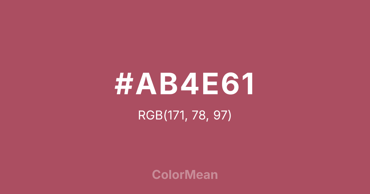 #AB4E61 RGB value is (171, 78, 97). The hex color red value is 171, green is 78, and blue is 97. Its HSL format shows a hue of 348°, saturation of 37 percent, and lightness of 49 percent. The CMYK process values are 0 percent, 54 percent, 43 percent, 33 percent.