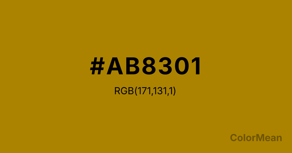 #AB8301 RGB value is (171, 131, 1). The hex color red value is 171, green is 131, and blue is 1. Its HSL format shows a hue of 46°, saturation of 99 percent, and lightness of 34 percent. The CMYK process values are 0 percent, 23 percent, 99 percent, 33 percent.