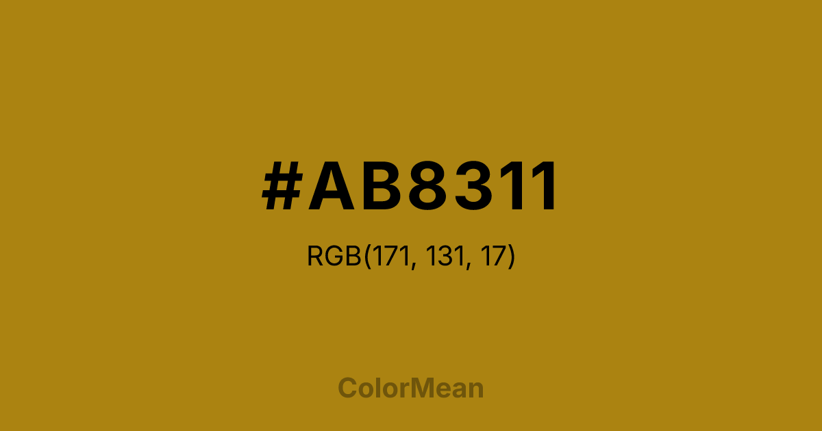 #AB8311 RGB value is (171, 131, 17). The hex color red value is 171, green is 131, and blue is 17. Its HSL format shows a hue of 44°, saturation of 82 percent, and lightness of 37 percent. The CMYK process values are 0 percent, 23 percent, 90 percent, 33 percent.