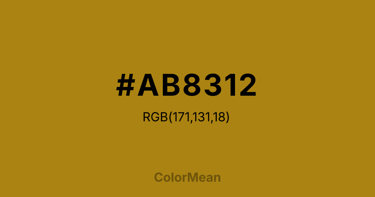 #AB8312 RGB value is (171, 131, 18). The hex color red value is 171, green is 131, and blue is 18. Its HSL format shows a hue of 44°, saturation of 81 percent, and lightness of 37 percent. The CMYK process values are 0 percent, 23 percent, 89 percent, 33 percent.