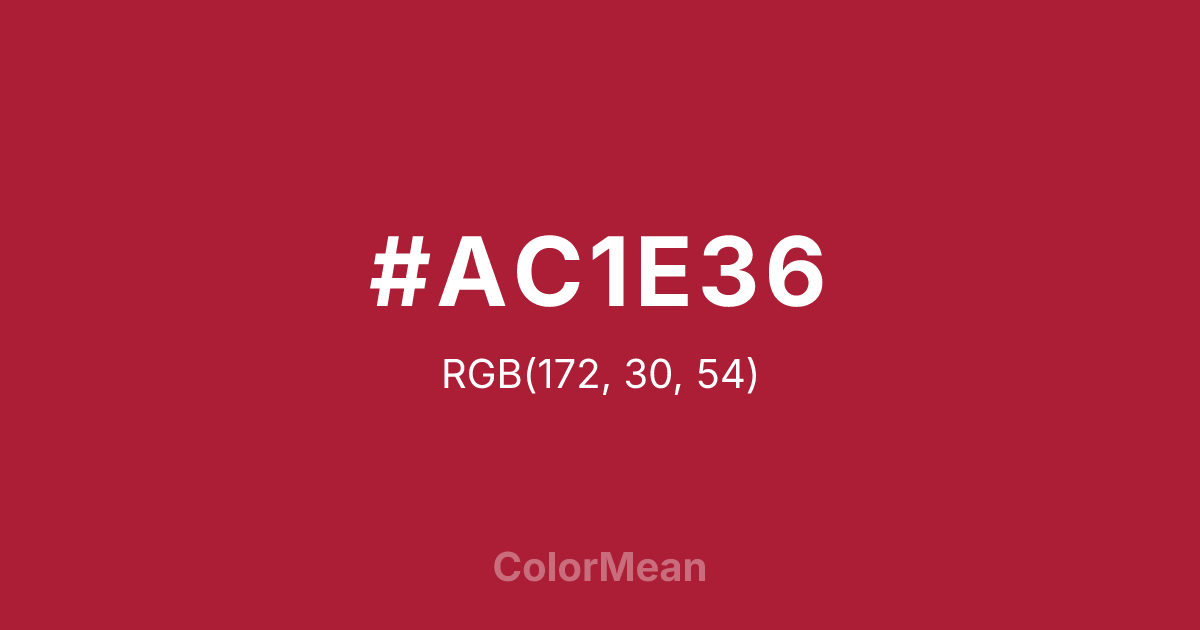 #AC1E36 RGB value is (172, 30, 54). The hex color red value is 172, green is 30, and blue is 54. Its HSL format shows a hue of 350°, saturation of 70 percent, and lightness of 40 percent. The CMYK process values are 0 percent, 83 percent, 69 percent, 33 percent.