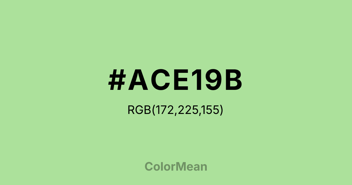 #ACE19B RGB value is (172, 225, 155). The hex color red value is 172, green is 225, and blue is 155. Its HSL format shows a hue of 105°, saturation of 54 percent, and lightness of 75 percent. The CMYK process values are 24 percent, 0 percent, 31 percent, 12 percent.