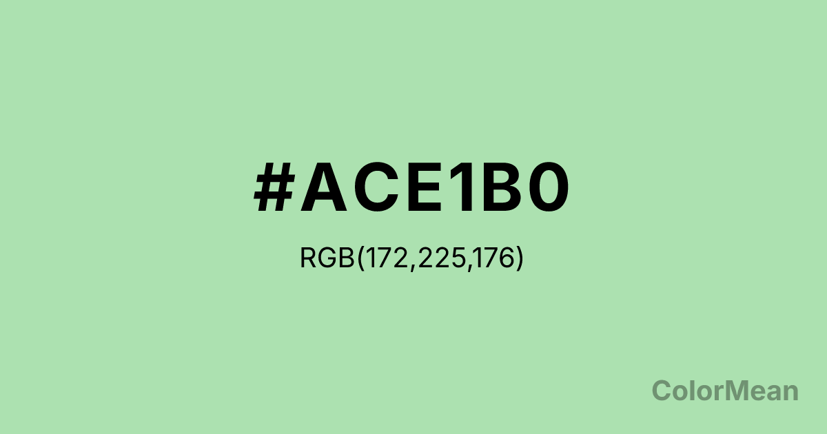 #ACE1B0 RGB value is (172, 225, 176). The hex color red value is 172, green is 225, and blue is 176. Its HSL format shows a hue of 125°, saturation of 47 percent, and lightness of 78 percent. The CMYK process values are 24 percent, 0 percent, 22 percent, 12 percent.