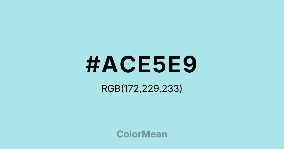 #ACE5E9 RGB value is (172, 229, 233). The hex color red value is 172, green is 229, and blue is 233. Its HSL format shows a hue of 184°, saturation of 58 percent, and lightness of 79 percent. The CMYK process values are 26 percent, 2 percent, 0 percent, 9 percent.