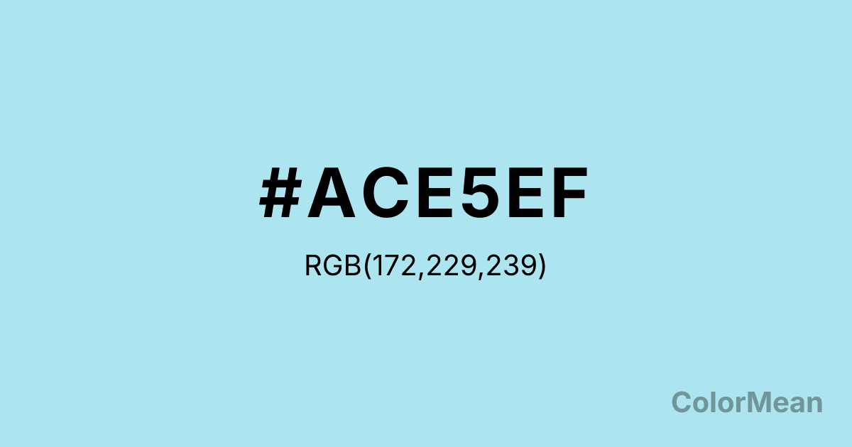 #ACE5EF RGB value is (172, 229, 239). The hex color red value is 172, green is 229, and blue is 239. Its HSL format shows a hue of 189°, saturation of 68 percent, and lightness of 81 percent. The CMYK process values are 28 percent, 4 percent, 0 percent, 6 percent.