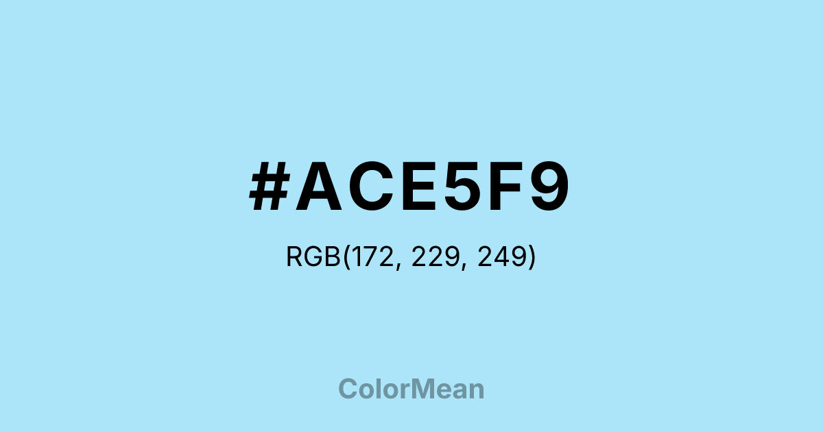 #ACE5F9 RGB value is (172, 229, 249). The hex color red value is 172, green is 229, and blue is 249. Its HSL format shows a hue of 196°, saturation of 87 percent, and lightness of 83 percent. The CMYK process values are 31 percent, 8 percent, 0 percent, 2 percent.