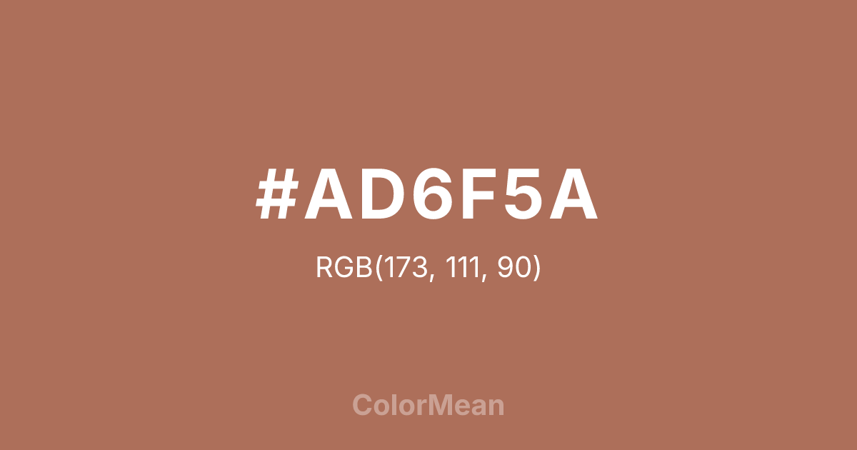 #AD6F5A RGB value is (173, 111, 90). The hex color red value is 173, green is 111, and blue is 90. Its HSL format shows a hue of 15°, saturation of 34 percent, and lightness of 52 percent. The CMYK process values are 0 percent, 36 percent, 48 percent, 32 percent.