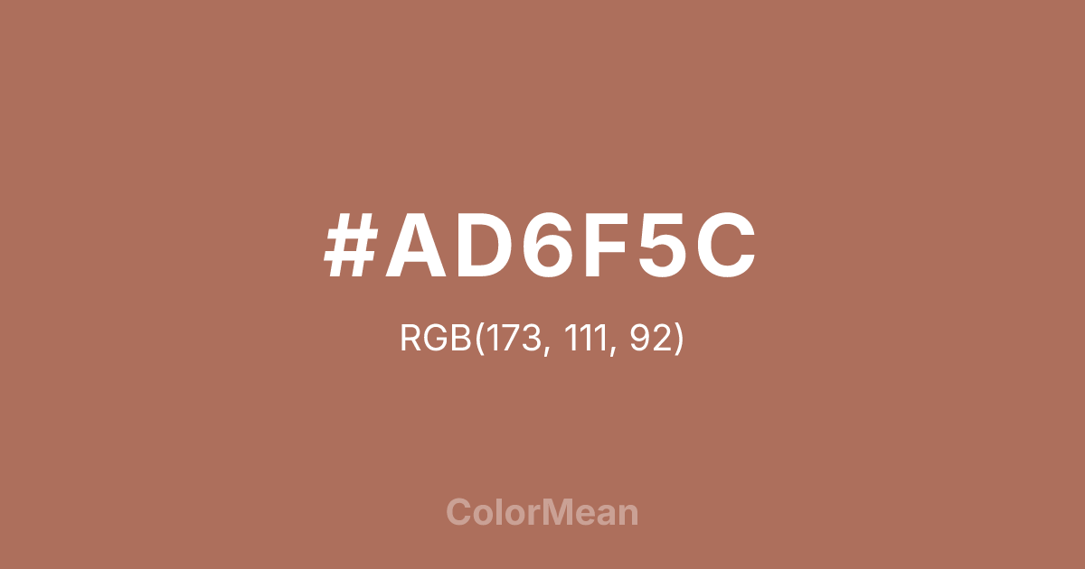 #AD6F5C RGB value is (173, 111, 92). The hex color red value is 173, green is 111, and blue is 92. Its HSL format shows a hue of 14°, saturation of 33 percent, and lightness of 52 percent. The CMYK process values are 0 percent, 36 percent, 47 percent, 32 percent.