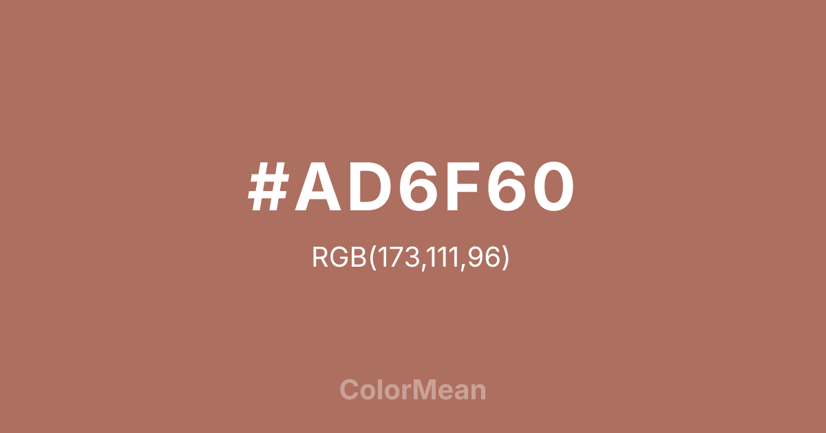 #AD6F60 RGB value is (173, 111, 96). The hex color red value is 173, green is 111, and blue is 96. Its HSL format shows a hue of 12°, saturation of 32 percent, and lightness of 53 percent. The CMYK process values are 0 percent, 36 percent, 45 percent, 32 percent.