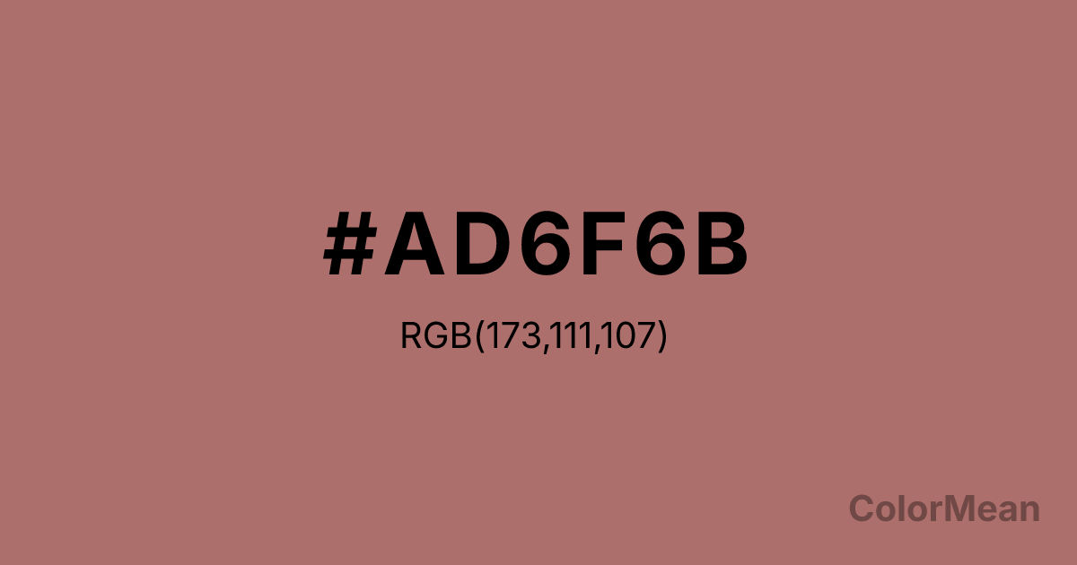 #AD6F6B RGB value is (173, 111, 107). The hex color red value is 173, green is 111, and blue is 107. Its HSL format shows a hue of 4°, saturation of 29 percent, and lightness of 55 percent. The CMYK process values are 0 percent, 36 percent, 38 percent, 32 percent.